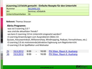 Das Dokument beschreibt eine Reihe von Fortbildungsveranstaltungen der Pädagogischen Hochschule Wien im Bereich E-Learning und digitale Medien für Lehrer, die Themen wie E-Learning 2.0, Moodle, interkulturelles Lernen, Blogging im Unterricht, mobile Learning mit iPads, Microsoft Office 365 und Programmierung mit Scratch abdecken. Ziel ist es, Lehrkräfte in der Anwendung neuer Technologien und Methoden zur Verbesserung des Unterrichts zu schulen. Teilnehmer können durch verschiedene Seminare und Workshops ihre digitalen Kompetenzen erweitern und innovative Unterrichtskonzepte erlernen.