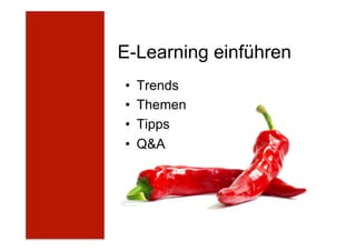 Das Dokument erläutert die Einführung von E-Learning und betont dessen Erfolg, wenn es konkreten Nutzen bietet und einfach zu nutzen ist. Es werden Trends wie Serious Games, Mobile Learning und MOOCs vorgestellt sowie Tipps zur Ausrichtung des E-Learnings auf konkrete Szenarien und zur Integration verschiedenster Lernformen gegeben. Claudia Musekamp, Expertin und Inhaberin von Infoport E-Learning, bietet maßgeschneiderte E-Learning-Lösungen für Unternehmen und Bildungseinrichtungen an.