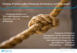 Das Dokument behandelt die Herausforderungen, die das Enterprise Architecture Management (EAM) in der Zusammenarbeit mit agilen Teams hat, insbesondere in Bezug auf Ad-hoc-Entscheidungen, verspätete Informationen und eine mangelnde Ausrichtung auf die Bedürfnisse der Teams. Es wird betont, dass EAM pragmatisch agieren muss, um Unterstützung für systemübergreifende Anforderungen und relevante, zeitnahe Informationen zu bieten. Die Notwendigkeit einer engeren Zusammenarbeit zwischen EAM und agilen Teams wird hervorgehoben, um effektive Lösungen zu gewährleisten.