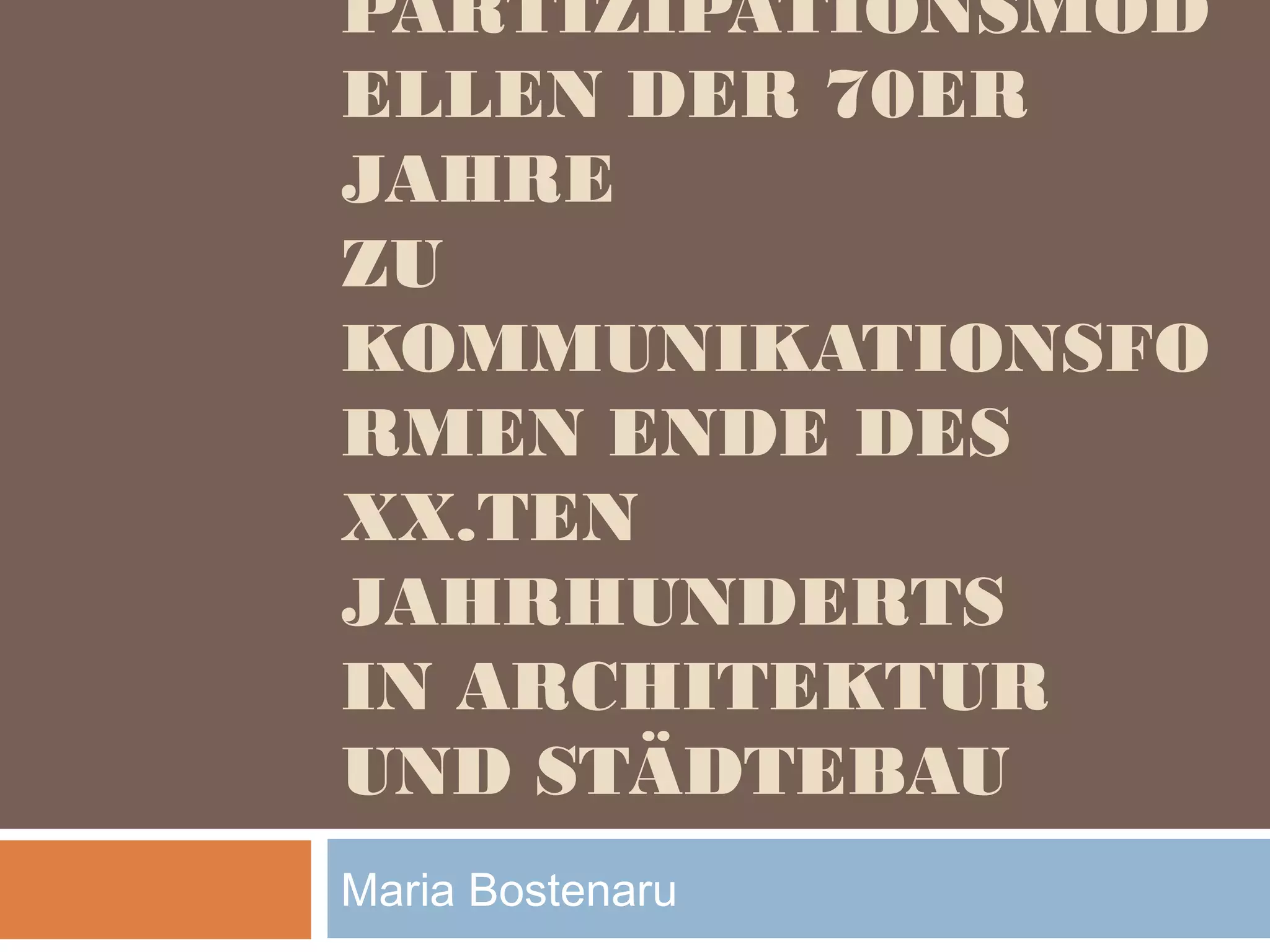 Das Dokument behandelt die Entwicklung von partizipativen Planungskonzepten in Architektur und Städtebau seit den 70er Jahren, einschließlich der Bürgerbeteiligung und strategischen Planung. Es analysiert verschiedene kommunikationsfördernde Ansätze und Fallstudien, die zeigen, wie aktive Bürgerinteraktion die Planung und Gestaltung von Räumen beeinflusst. Zudem wird die Wechselwirkung zwischen Kommunikation und Partizipation durch verschiedene methodische Ansätze und empirische Fallbeispiele verdeutlicht.
