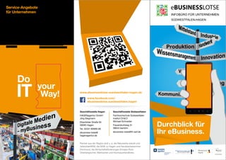 Das Dokument beschreibt die Dienstleistungen des Infobüros für Unternehmen Südwestfalen-Hagen, das Unterstützung in den Bereichen eBusiness, Marktbeobachtung, Personalmarketing und Innovationsmanagement bietet. Es informiert über die Zusammenarbeit mit regionalen Partnern und das Angebot von Workshops sowie Netzwerktreffen für Unternehmen. Zudem wird auf die Förderung durch das Bundesministerium für Wirtschaft und Technologie hingewiesen, die kleinen und mittleren Unternehmen bei der Nutzung moderner Informations- und Kommunikationstechnologien hilft.