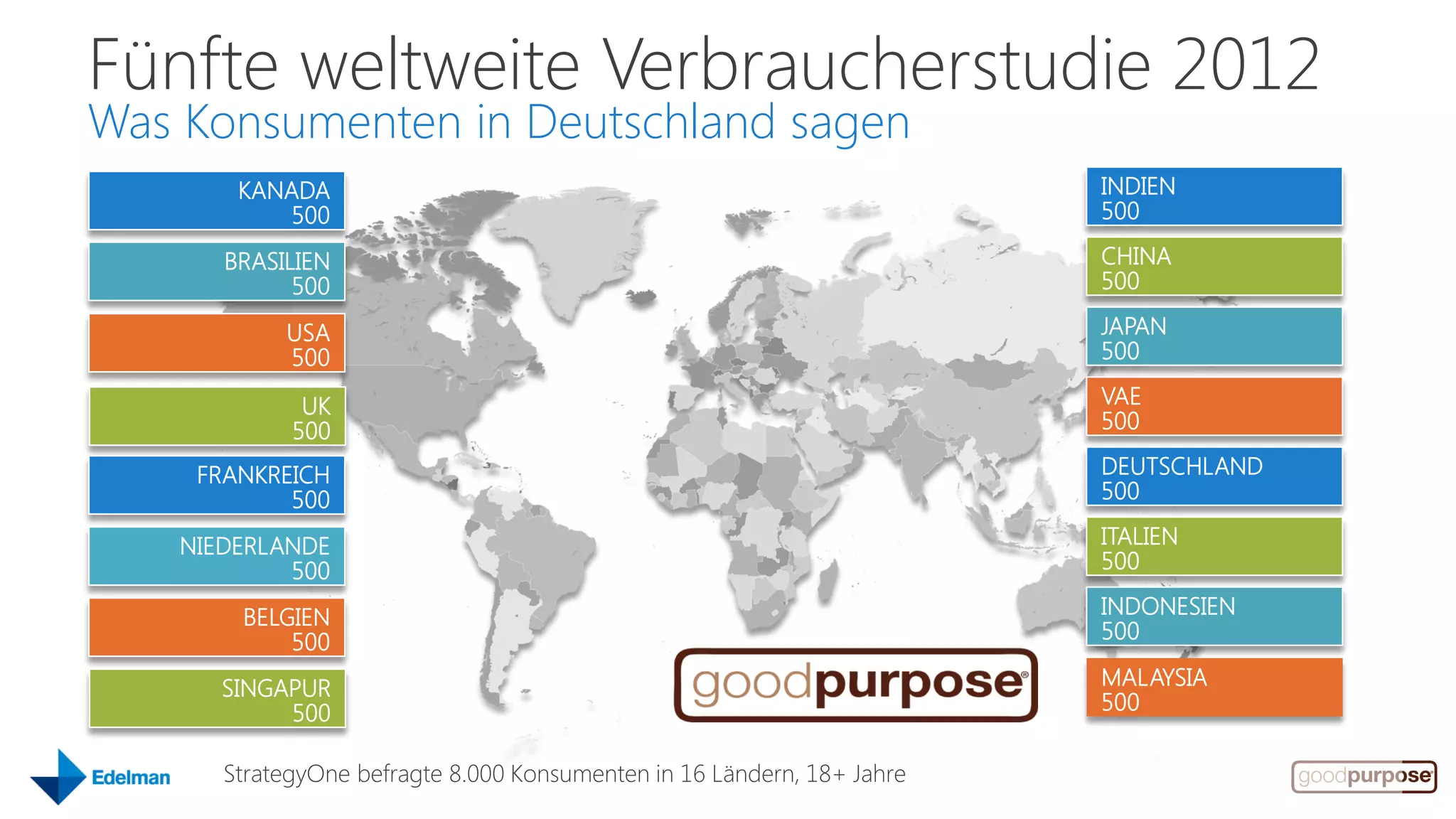 Die fünfte weltweite Verbraucherstudie 2012 zeigt, dass Vertrauen in nachhaltiges Handeln für Unternehmen entscheidend ist, da weniger als 40% deutscher Großunternehmen klare Ziele für gesellschaftliches Engagement formulieren. Deutsche Konsumenten verlangen mehr gesellschaftliche Verantwortung und sind bereit, Produkte von Firmen zu unterstützen, die sich sozial engagieren. Zudem erkennen die Konsumenten ihren Einfluss auf die Gesellschaft und erwarten eine Zusammenarbeit zwischen Wirtschaft und Regierung zur Lösung sozialer Probleme.
