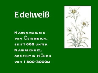 Das Edelweiß ist die Nationalblume von Österreich und steht seit 1886 unter Naturschutz. Es wächst in Höhenlagen zwischen 1800 und 3000 Metern. Dieses Symbol der Alpen ist für seine Schönheit und Seltenheit bekannt.