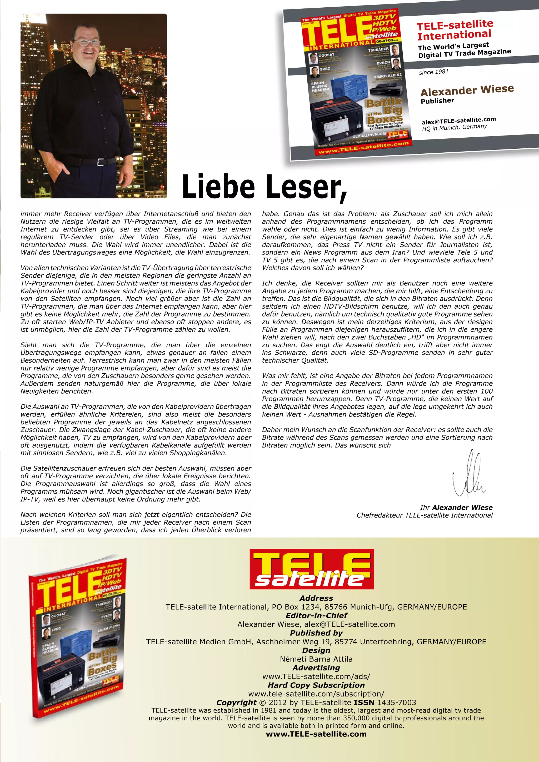 Das Dokument thematisiert die Herausforderungen, die Zuschauer bei der Auswahl von TV-Programmen aufgrund der überwältigenden Anzahl an Sendern, insbesondere im Internet und über Streaming-Dienste, haben. Es wird darauf hingewiesen, dass Receiver mehr Informationen über Programme benötigen, insbesondere hinsichtlich Bildqualität und Bitraten, um fundierte Entscheidungen treffen zu können. Der Autor, Alexander Wiese, fordert eine bessere Sortierung und Kennzeichnung der Programme, um die Auswahl für die Nutzer zu erleichtern.