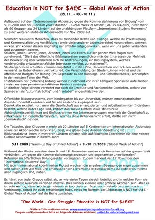Die 'Global Week of Action' unter dem Motto 'Education is not for $a£€' findet im November 2009 statt und wird von über 60 Gruppen in 24 Ländern organisiert, um gegen die Kommerzialisierung von Bildung zu protestieren. Bildung ist weltweit zunehmend von privaten Interessen beeinflusst, was zu höheren Studiengebühren und einer Abhängigkeit von Sponsoren führt. Die Aktionen zielen darauf ab, ein freies und zugängliches öffentliches Bildungssystem zu fördern, das den Interessen der Mehrheit dient.