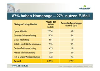 Die Präsentation von Torsten Schwarz untersucht die aktuellen Trends im E-Mail-Marketing, wobei 87% der befragten Unternehmen eine Homepage haben und 27% E-Mail-Marketing verwenden. 2013 planen 56% der Unternehmen, ihr Budget für E-Mail-Marketing zu erhöhen, was es zu einem der führenden Kanäle im Marketing macht. E-Mails sind besonders wichtig für Smartphone-Nutzer, wobei jeder dritte Empfänger erreicht wird und jeder zehnte auf die E-Mail klickt.
