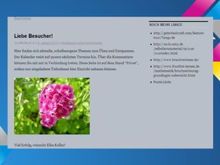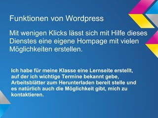 Das Dokument beschreibt, wie man mit WordPress geschlossene Lernseiten erstellt, um wichtige Informationen und Materialien für Schüler bereitzustellen. Lehrende können Arbeitsblätter bereitstellen, Links zu Online-Übungen und Videos hinzufügen sowie sensiblere Inhalte sicher veröffentlichen. Es wird auch betont, dass Schüler und Eltern über neue Inhalte benachrichtigt werden können und Rückmeldungen durch Kommentare möglich sind.