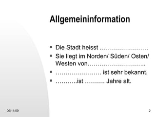 Die Stadt heißt ... und liegt im Norden/Süden/Osten/Westen von .... Sie ist sehr bekannt, hat eine Geschichte von ... Jahren und bietet verschiedene Sehenswürdigkeiten. Die Stadt wird als ... beschrieben, sei es schön, ruhig, interessant oder hektisch.