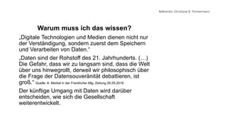 Die Präsentation von Christiane B. Timmermann gibt einen umfassenden Überblick über die Blockchain-Technologie, einschließlich ihrer Definition als dezentrale Datenbank, ihrer Funktionsweise und der Anwendungsbereiche. Zu den Anwendungsmöglichkeiten zählen Eigentumsnachweise, Transaktionsprozesse und Verwaltungsprozesse, wobei die Blockchain Vorteile wie Vertrauen, Transparenz und Kosteneinsparungen bietet. Die Diskussion thematisiert auch die gesellschaftlichen Auswirkungen des Datenumgangs und die Rolle der Regierung in diesem Kontext.