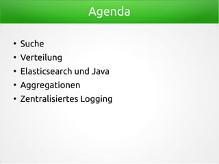 Das Dokument bietet eine umfassende Einführung in Elasticsearch, einschließlich Installation, Indizierung und Suchanfragen über HTTP und Java. Es behandelt Themen wie Aggregationen, zentralisiertes Logging und die Architektur von Elasticsearch-Clustern, einschließlich Sharding und Replikation. Zudem werden spezifische Inhalte und Beispiele für die Nutzung von Elasticsearch vorgestellt.