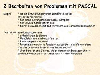 Das Dokument beschreibt eine Einführung in die Programmierung mit dem Entwicklungssystem Pascal Delphi, einschließlich der Vorteile von Windows-Programmen und der Entwicklung und Einteilung von Programmiersprachen von der Maschinensprache bis hin zu modernen KI-Programmiersprachen. Es werden die Konzepte von Algorithmen, Programmen, Compilern und Interpretern erläutert, sowie die Funktionen der Entwicklungsumgebung in Delphi. Zudem wird das Prinzip der Programmierung durch den Informationsfluss von Eingabe, Verarbeitung und Ausgabe erklärt.
