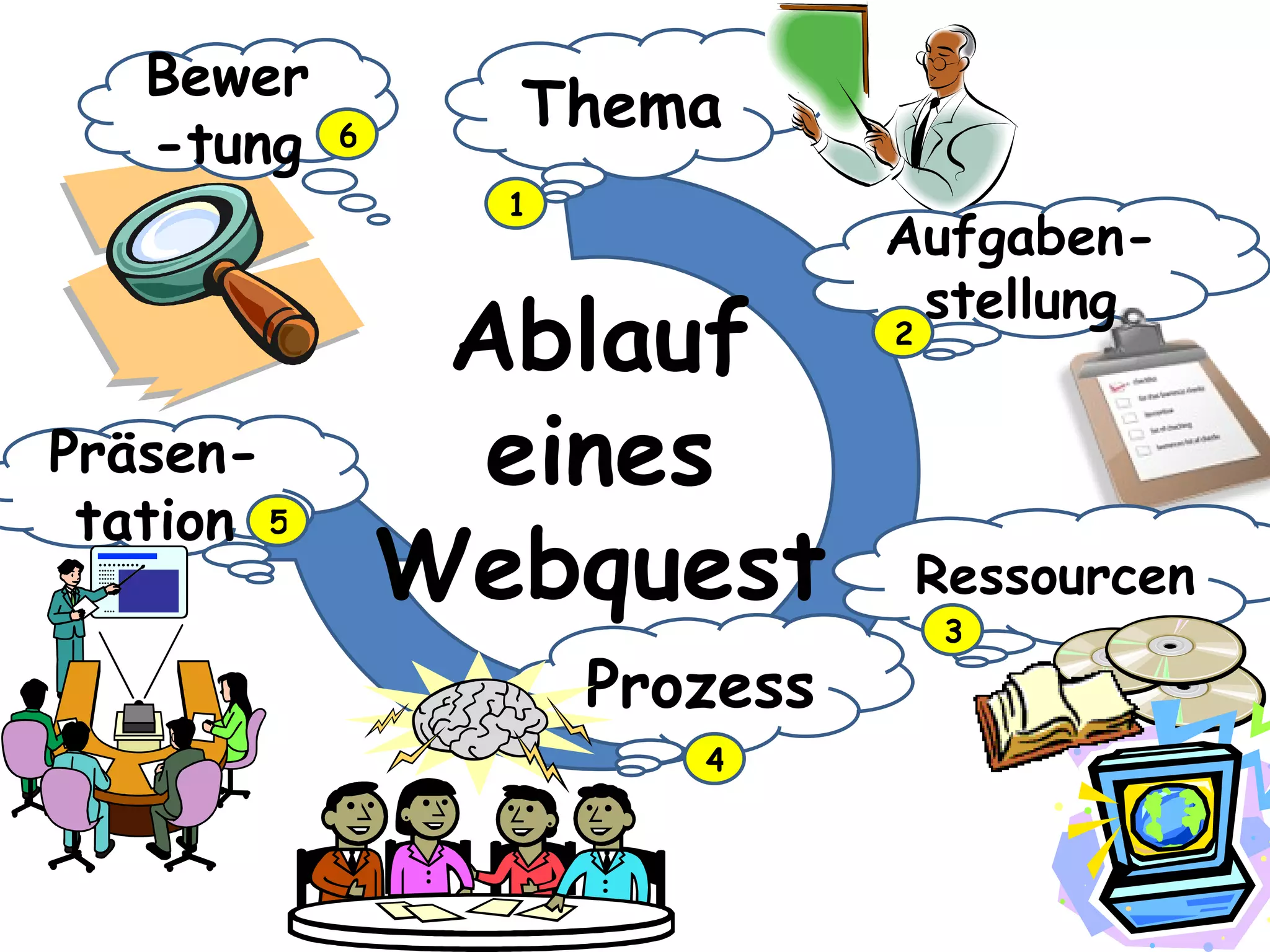 Das Dokument beschreibt den Ablauf eines Webquests, der aus den Phasen Aufgabenstellung, Ressourcen, Prozess, Präsentation und Bewertung besteht. Jede Phase ist durch nummerierte Schritte strukturiert. Der Schwerpunkt liegt auf der effektiven Durchführung des Webquests.