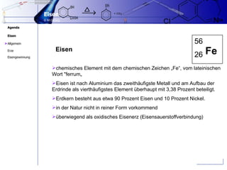 Eisen ist ein chemisches Element mit dem Symbol 'Fe' und nach Aluminium das zweithäufigste Metall der Erdkruste. Es ist hauptsächlich in Form von Erzen wie Hämatit, Pyrit und Magnetit in der Natur zu finden und hat eine bedeutende Rolle in der Herstellung von Eisen und Stahl. Der Erdkern besteht zu etwa 90 Prozent aus Eisen und zu 10 Prozent aus Nickel.