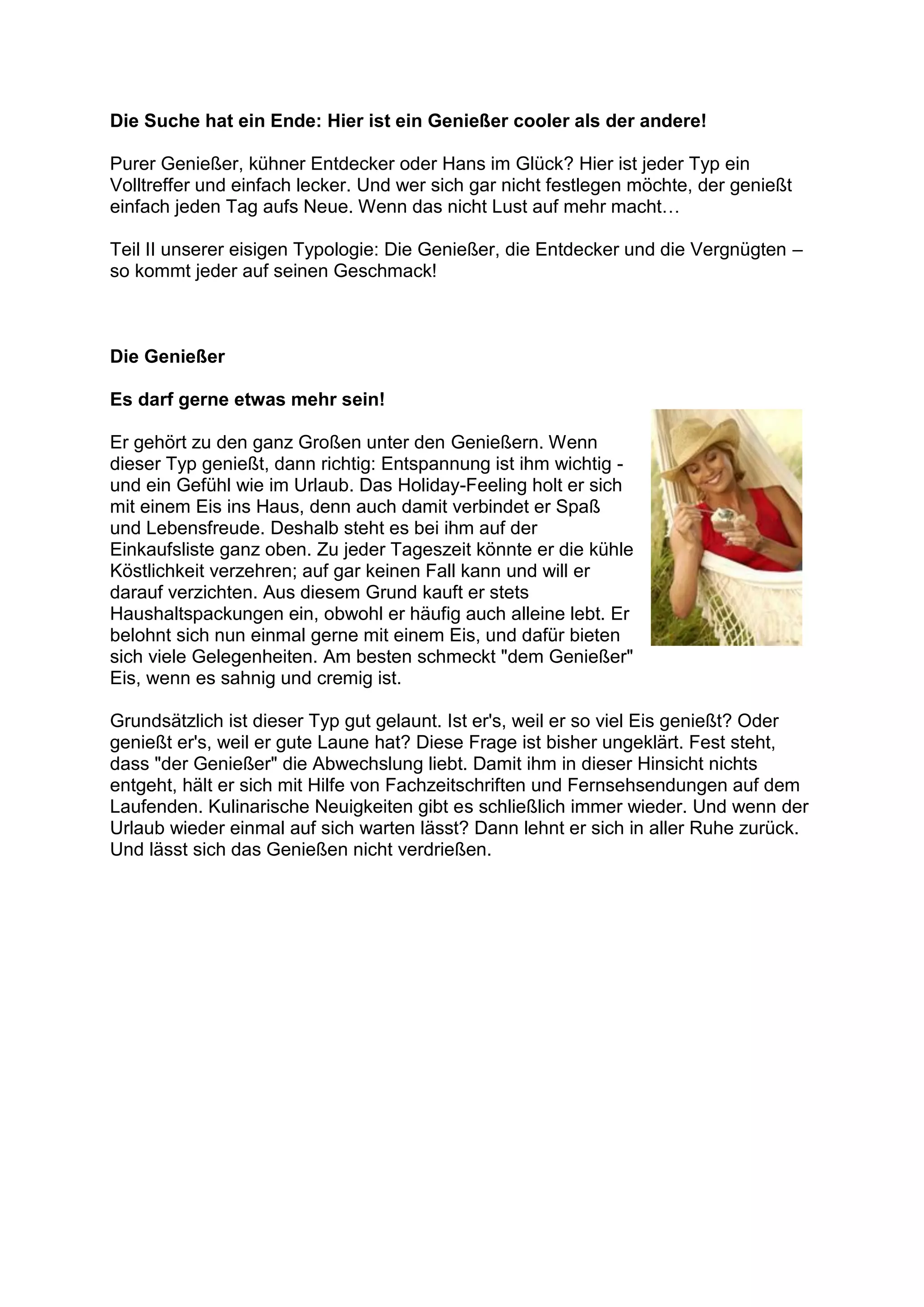 Das Dokument beschreibt drei Typen von Eisgenießern: die Genießer, die Entdecker und die Vergnügten. Jeder Typ hat unterschiedliche Vorlieben und Ansprüche an Eis: Genießer schätzen cremige Sorten und bieten sich häufig selbst Belohnungen, Entdecker suchen nach außergewöhnlichen Geschmäckern und sind experimentierfreudig, während Vergnügte die Freude am Eis in allen Lebenslagen genießen und oft jüngere Menschen repräsentieren. Gemeinsam ist ihnen die Liebe zum Eis und die Suche nach neuen Geschmackserlebnissen.