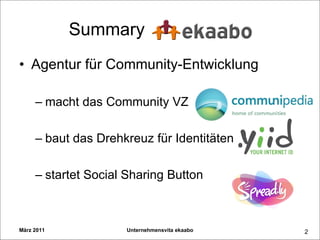 Die ekaabo GmbH, gegründet im Dezember 2006 von Marco Ripanti, hat sich auf Community-Lösungen spezialisiert und bietet Plattformen wie Communipedia und Yiid an, um online Identitäten zu verwalten. Das Unternehmen erlebte von 2007 bis 2010 ein signifikantes Wachstum, das durch technische Innovationen und den Ausbau seiner Dienstleistungen unterstützt wurde. Im März 2011 waren zentrale Aspekte ihrer Strategie die Konsolidierung ihrer Produkte und die Einführung eines Social Sharing Buttons zur Verbesserung der Nutzerinteraktionen.