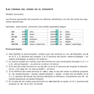 Das Dokument erklärt die Konjugation von Verben im Präsens der deutschen Grammatik. Es behandelt sowohl reguläre als auch unregelmäßige Verben, deren Besonderheiten und Ausnahmen in der Formgebung. Zusätzlich werden die gebräuchlichen Hilfs- und Modalverben und deren Konjugationsmuster erläutert.