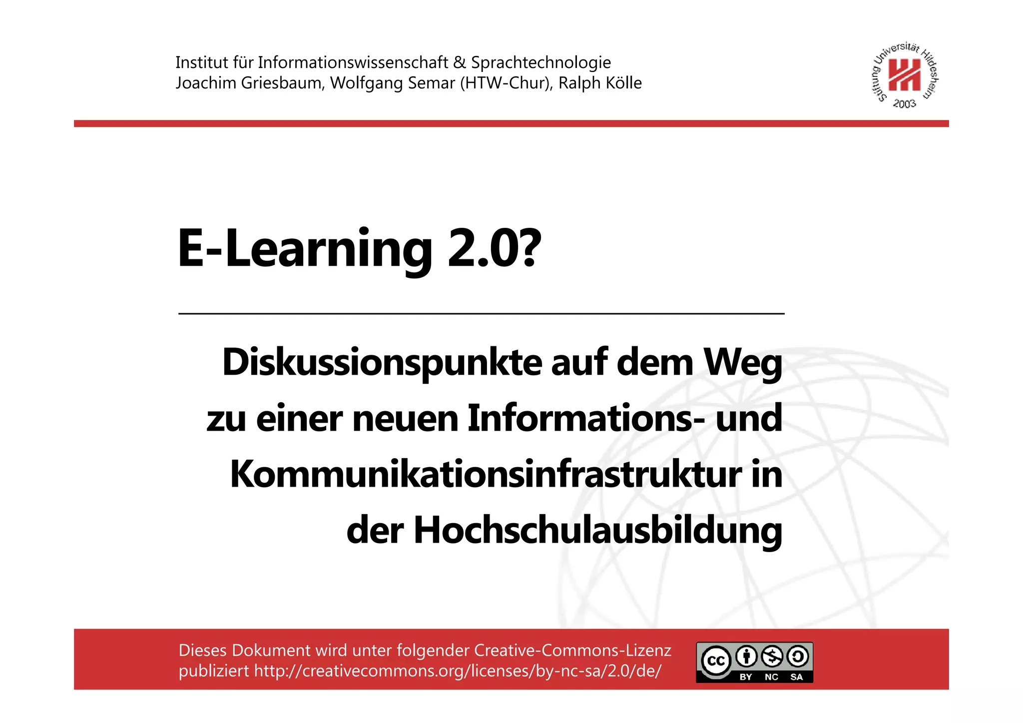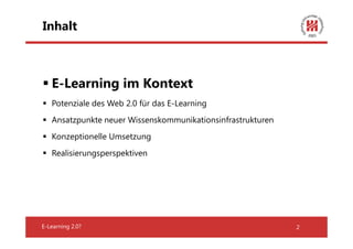 Das Dokument behandelt die Herausforderungen und Chancen von E-Learning 2.0 im Hochschulkontext, insbesondere die Integration von Web 2.0-Technologien zur Förderung selbstgesteuerten und gemeinschaftlichen Lernens. Es wird auf den dringend notwendigen Forschungs- und Entwicklungsbedarf hingewiesen, um die mögliche Transformation der Wissenskommunikationsinfrastruktur in der Hochschulbildung zu unterstützen. Zudem werden verschiedene Ansätze und Realisierungsperspektiven für die Umsetzung E-Learning 2.0 diskutiert.
