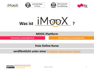 Das Dokument beschreibt verschiedene Angebote der Technischen Universität Graz im Bereich informatische Grundbildung und E-Learning, einschließlich MOOC-Plattformen und spezifischer Online-Kurse zu Programmierung für Kinder und Jugendliche. Es werden Tools und Materialien zur Förderung der digitalen Bildung, wie Calliope mini und Ozobots, sowie anstehende Workshops vorgestellt. Zudem wird auf die Bedeutung von Learning Analytics zur Verbesserung des Lernprozesses hingewiesen.