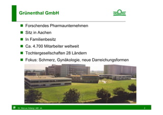 Das Dokument präsentiert eine Analyse von E-Learning mit Moodle, einem Open Source Lernmanagementsystem, das bei Grünenthal GmbH eingesetzt wird. Es werden Vor- und Nachteile von E-Learning, Herausforderungen im unternehmerischen Umfeld sowie die Vorteile von Open Source Software angesprochen. Zudem wird Moodle als flexible und kostengünstige Lösung hervorgehoben, unterstützt von einer Vielzahl aktiver Nutzer-Communities.