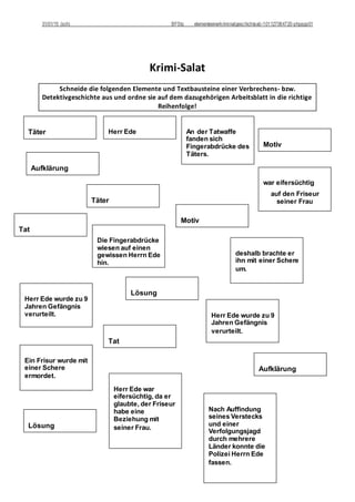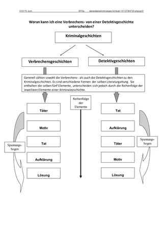 Das Dokument erläutert die Struktur und die grundlegenden Elemente von Verbrechens- und Detektivgeschichten innerhalb der Kriminalliteratur. Es beschreibt die Reihenfolge der Elemente wie Täter, Motiv, Tat, Aufklärung und Lösung, die in beiden Geschichtstypen vorkommen, aber unterschiedlich angeordnet sind. Zudem wird das biblische Beispiel von Kain und Abel herangezogen, um typische Elemente einer Kriminalgeschichte zu identifizieren und zu analysieren.