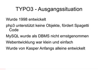 Das Dokument beschreibt die Entwicklung und den aktuellen Stand von TYPO3 sowie die Notwendigkeit von Flow3 als Antwort auf die Grenzen von TYPO3. Flow3 ist als neues Framework konzipiert, das saubere Programmierung und neue Entwicklungsmethoden fördert, insbesondere für Version 5 von TYPO3. Es wird erwartet, dass TYPO3 Version 5 bald verfügbar sein wird, was eine Auseinandersetzung mit den Migrationspfaden erfordert.