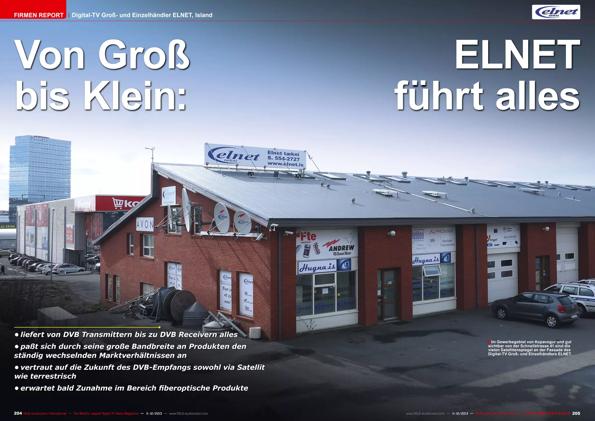 Die Firma Elnet in Island bietet eine breite Palette von Digital-TV-Produkten, darunter DVB-Transmitter und -Receiver, und hat sich an die sich verändernden Marktverhältnisse angepasst. Mit 600 Quadratmetern Verkaufsfläche und einem Portfolio, das alles von Messgeräten bis zu großen Satellitenspiegeln umfasst, beliefert Elnet die Mehrheit der digitalen TV-Sender in Island. Angesichts der topografischen Herausforderungen des Landes bleibt die satellitengestützte und terrestrische Empfangstechnik die beste Lösung für ländliche Gebiete, während das Unternehmen auch auf eine zukünftige Nachfrage nach glasfaserbasierten Produkten setzt.
