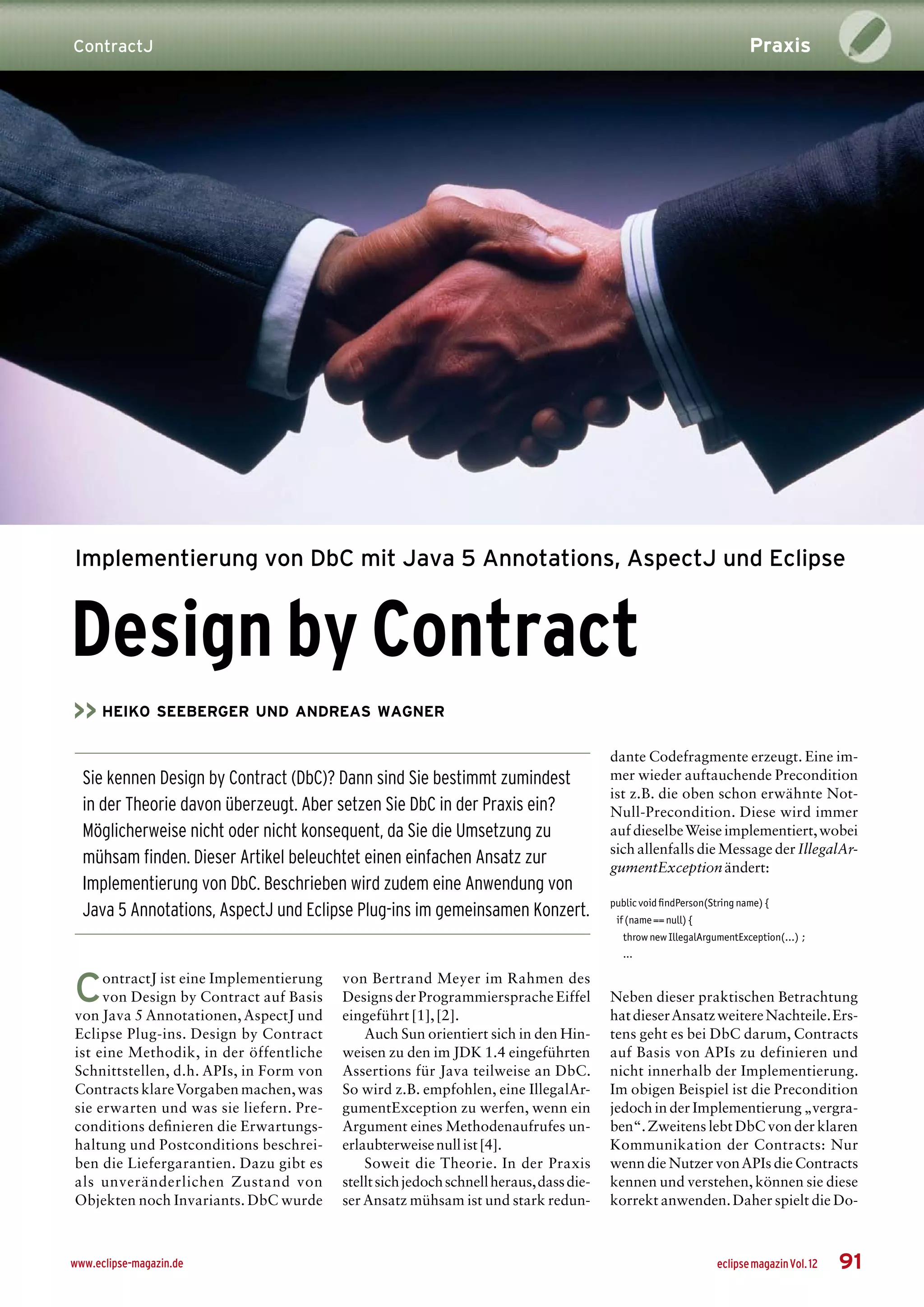 Der Artikel befasst sich mit der Implementierung von Design by Contract (DbC) in Java unter Verwendung von Annotations, AspectJ und Eclipse, um die Programmierpraktiken zu verbessern. Der Ansatz analysiert den Einsatz von Vorbedingungen und Nachbedingungen, um klare Vertragsvereinbarungen zwischen Methoden und deren Aufrufern zu definieren. ContractJ wird als Werkzeug vorgestellt, das die Integration und Anwendung dieser Prinzipien erleichtert und dabei auch die Modularisierung durch Aspektorientierung integriert.