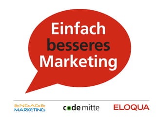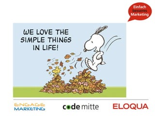 Das Dokument präsentiert eine Agenda über gutes Marketing, in der die Referenten Lukas Schröder und Matthias Rothkoegel ihre Erfahrungen und Ansichten zu Marketingstrategien, -automatisierung sowie -erfolg darlegen. Es wird betont, dass modernes Marketing datenbasiert, kundenorientiert und auf Individualität ausgelegt sein sollte, um erfolgreich zu sein. Der Fokus liegt auf der Vereinfachung von Marketingprozessen durch integrierte Tools und Plattformen.