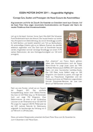 Die Essen Motor Show 2011 präsentiert vom 26. November bis 4. Dezember zahlreiche Highlights, darunter innovative Elektrofahrzeuge, legendäre Rallye-Autos und beeindruckende Oldtimer. Die Messe bietet eine Plattform für wichtige Hersteller und Designer, die ihre neuesten Konzepte und Techniken vorstellen, während auch verschiedene Motorsport-Events und Wettbewerbe für Spannung sorgen. Besondere Attraktionen sind die Rallye Breslau, eine Offroad-Rallye für Amateure, sowie der Hella Show & Shine Award, der die besten getunten Fahrzeuge prämiert.