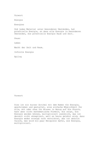 Das Dokument behandelt das Konzept von Energie im Kontext von Raum und Zeit, argumentiert, dass Energie in besonderen Umständen unendlich multipliziert werden kann, und gibt verschiedene Beispiele hierfür, wie Feuer, die Bewegung von Planeten und das Wachstum von Pflanzen. Es wird betont, dass das Verständnis von Energie und deren Veränderungen fundamental für die Physik ist und dass die aktuellen Lehren möglicherweise nicht alle Aspekte der Energie abdecken. Der Artikel schließt mit der Idee, dass das Wissen über Energie ständig wächst und Raum für neue Entdeckungen bietet.