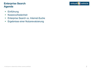 Das Dokument behandelt die Herausforderungen und Anforderungen an die Enterprise Search in Unternehmen, die durch verschiedene IT-Systeme und Wissensinseln kompliziert werden. Es wird erläutert, dass eine unzureichende Suchqualität und die Unkenntnis über die Struktur von Informationen sowohl die Produktivität der Mitarbeiter als auch die Entscheidungsfindung negativ beeinflussen können. Die Evaluierung der Nutzerzufriedenheit zeigt, dass die Suche nach relevanten Informationen oft schwieriger ist als die Navigation durch eine gut strukturierte Ordnerhierarchie.