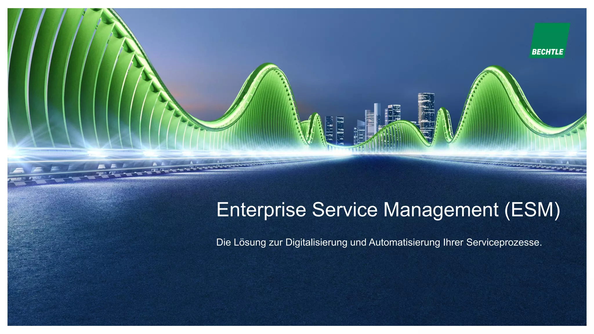 Das Dokument beschreibt die Enterprise Service Management (ESM) Plattform von Bechtle, die zur Digitalisierung und Automatisierung von Serviceprozessen konzipiert ist. Die Plattform ermöglicht eine benutzerfreundliche Oberfläche zur vereinfachten Abwicklung von IT-Services, HR-Prozessen und Facility Management, darunter die Automatisierung einfacher Anfragen und die Bereitstellung von 24/7-Support. Mit integrierten Tools wie dem ESM-Bot und verschiedenen Dashboards wird eine effizientere Bearbeitung von Serviceanfragen und die Einhaltung von SLAs ermöglicht.