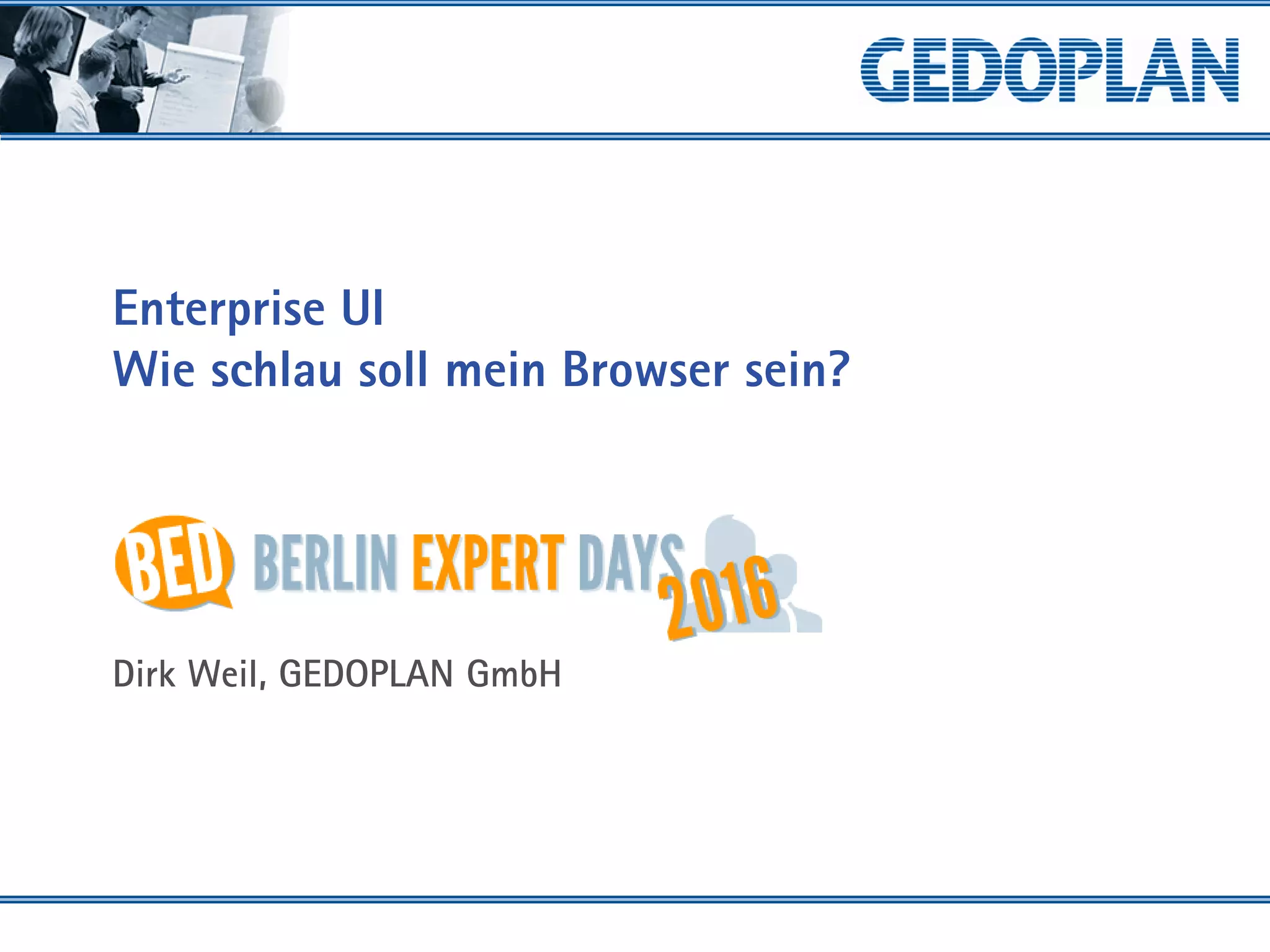 Die Präsentation von Dirk Weil von Gedoplan GmbH bietet eine Einführung in moderne Enterprise-UI-Technologien wie JavaServer Faces (JSF), Vaadin und AngularJS, einschließlich ihrer Architekturen und Anwendungsbeispiele. Es werden Vor- und Nachteile jedes Frameworks sowie deren Integration in Backend-Systeme diskutiert, um die Entwicklung von Rich Internet Applications zu unterstützen. Ziel ist es, die Komplexität der UI-Entwicklung zu reduzieren und die Benutzererfahrung zu verbessern.