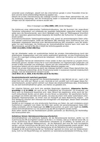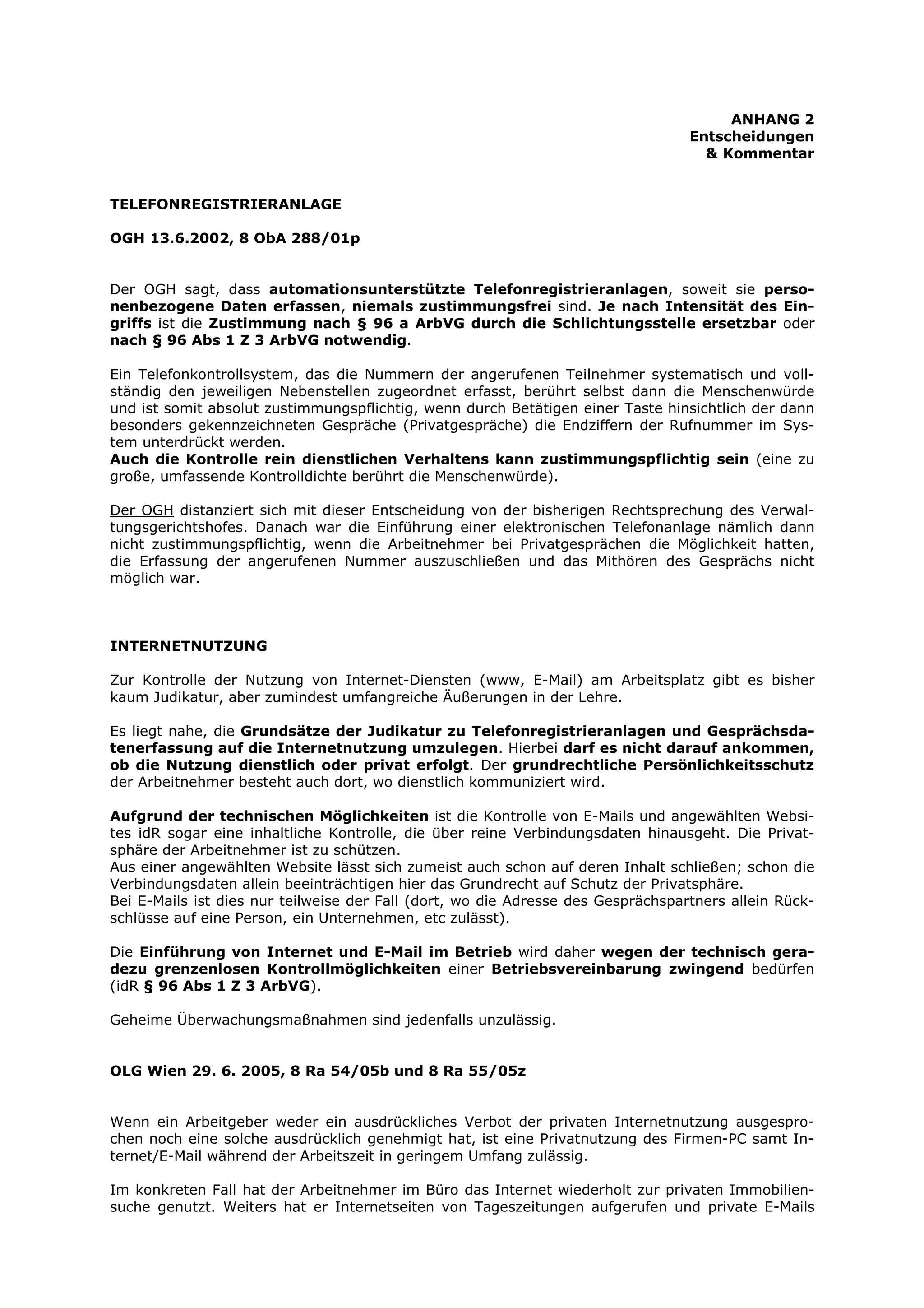 Das OGH-Urteil vom 13.6.2002 legt fest, dass automatisierte Telefonregistrieranlagen, die personenbezogene Daten erfassen, zustimmungspflichtig sind, auch wenn Maßnahmen getroffen werden, um private Gespräche zu anonymisieren. Die Entscheidung distanziert sich von früherer Rechtsprechung und besagt, dass sämtliche Kontrollen, auch im Internet, den Persönlichkeitsschutz der Arbeitnehmer wahren müssen. Bei der privaten Internetnutzung am Arbeitsplatz ist in geringem Umfang eine Nutzung erlaubt, deren übermäßige Kontrolle jedoch einer Betriebsvereinbarung bedarf.