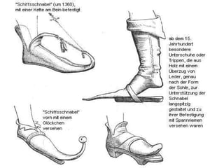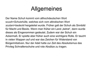 Der Schuh, abgeleitet vom althochdeutschen 's cuoh', hatte historisch eine symbolische Bedeutung für Macht und Besitz und war Teil von Wappen und Bürgerinitiativen. Der moderne Schuh besteht aus einem Schaft und einem Boden, wobei der Schaft verschiedene Teile wie Innenschaft und Außenschaft umfasst, und die Sohle aus Innensohle und Laufsohle besteht. Die Entwicklung des Schuhs reicht bis zu Ötzi vor 5000 Jahren zurück und zeigt Veränderungen wie längere Spitzen im 13. Jh., Schnabelschuhe im 14. Jh. und die Einführung des linken und rechten Schuhs im 19. Jh.