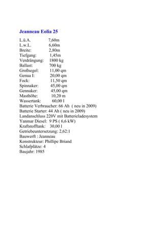 Die Segelyacht "Foo Fighter" ist eine gebrauchte Jeanneau Eolia 25, die nie chartermäßig genutzt wurde und 1985 gebaut wurde. Sie bietet Platz für 4 Personen, hat umfassende technische Ausstattungen und wurde regelmäßig gewartet; der Preis beträgt 21.900 Euro, Verhandlung möglich. Der Verkäufer bietet zusätzlich eine Vielzahl von Ausrüstungsgegenständen und möchte das Boot verkaufen, um sich zu vergrößern.