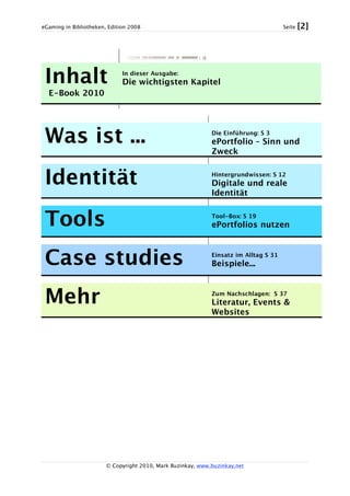 Das Dokument behandelt die Konzepte und Vorteile von E-Portfolios als digitale Sammlungen persönlicher Artefakte, die individuelle Lebensgeschichten dokumentieren und als Werkzeug zur Reflexion, Planung von Lebenszielen und zur Darstellung von Fähigkeiten dienen. E-Portfolios sind dynamisch, ermöglichen eine intensivere Auseinandersetzung mit eigenen Zielen und Entwicklungen, und bieten eine flexible, multimediale Plattform zur Selbstpräsentation in verschiedenen Kontexten von Bildung bis hin zur beruflichen Entwicklung. Zudem wird die Evolution von traditionellen Portfolios zu E-Portfolios skizziert und deren Bedeutung für die digitale Identität hervorgehoben.