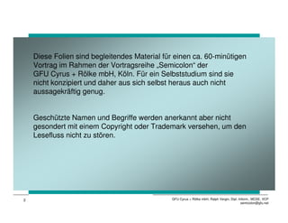 Das Dokument ist eine Präsentation über virtuelle Systeme und deren Anwendungen, die im Rahmen einer Vortragsreihe am 10. April 2007 gehalten wurde. Es behandelt verschiedene Virtualisierungstechnologien und deren Vorteile sowie Herausforderungen, insbesondere im Hinblick auf Hardware-Abhängigkeiten und Ressourcenmanagement. Zudem werden Methoden zur Migration und Verwaltung virtueller Maschinen sowie High Availability-Lösungen diskutiert.