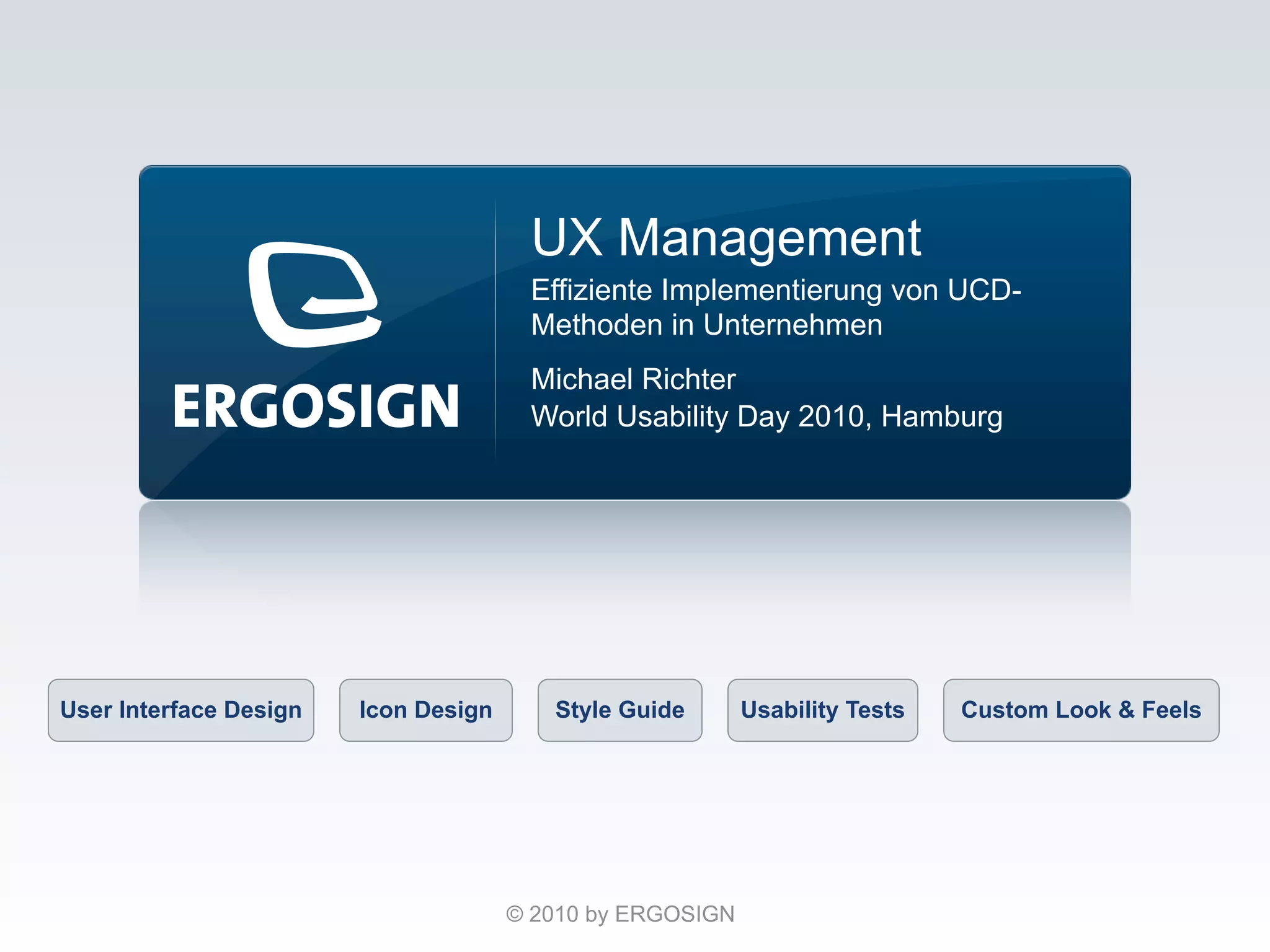 Das Dokument beschreibt die Implementierung nutzerzentrierter Designmethoden (UCD) in Unternehmen, die idealerweise in drei Phasen verläuft: Schaffung von Bewusstsein, Umsetzung durch erste Projekte und Definition von Standards. Es werden zentrale Herausforderungen und Ansätze zur Bewertung des Nutzens von UCD durch Erfolgsgeschichten und ROI-Analysen thematisiert. Zudem werden Methoden und Schulungen zur Integration von UCD in den Entwicklungsprozess vorgestellt.