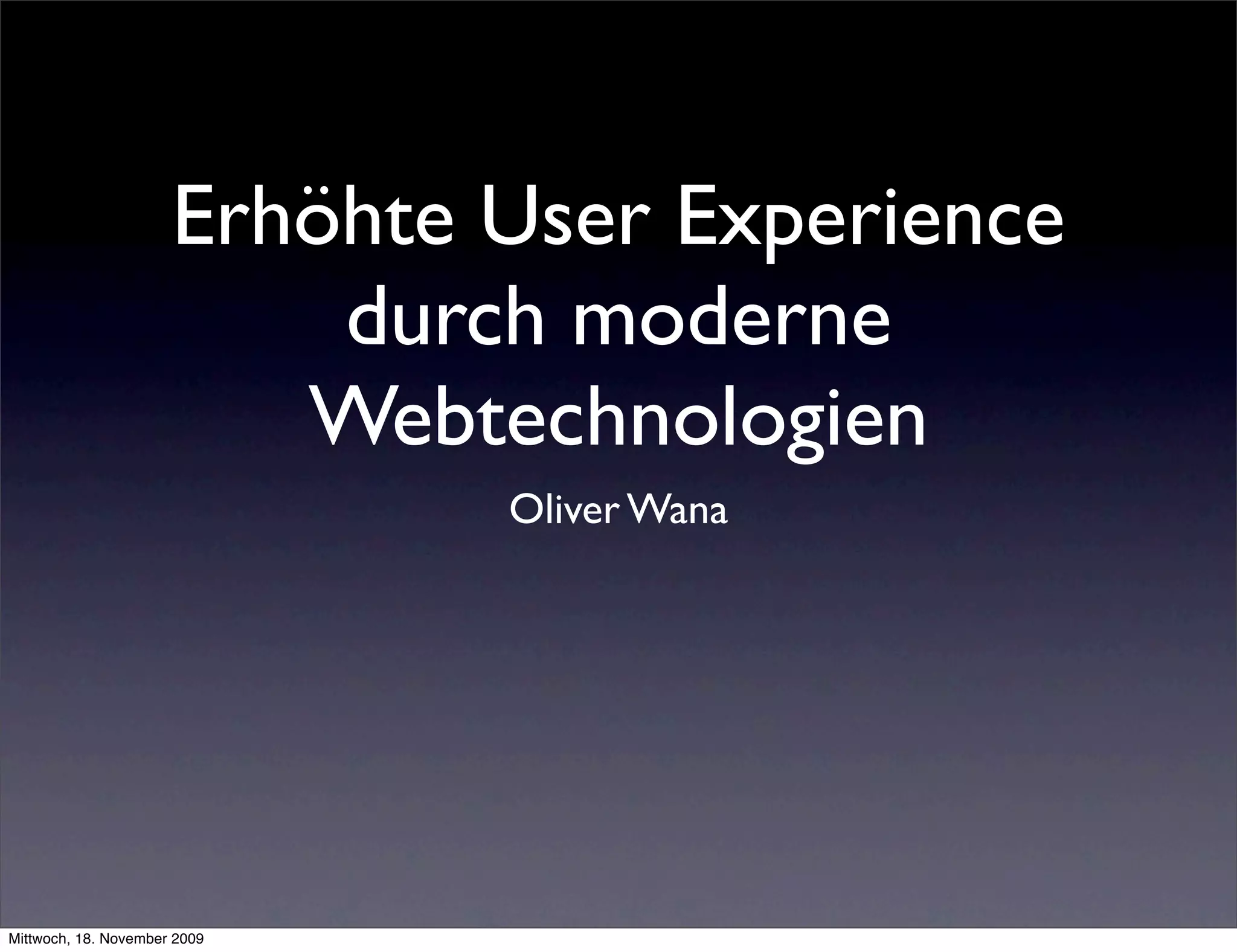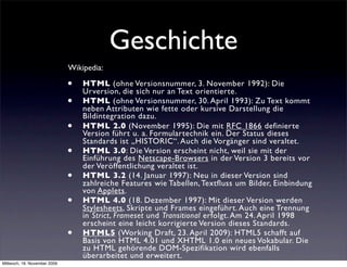 Das Dokument behandelt die Entwicklung von HTML und modernen Webtechnologien, beginnend mit den frühen Versionen von HTML bis hin zu HTML5, und beschreibt wesentliche Verbesserungen in der Oberflächengestaltung durch CSS3, einschließlich neuer Effekte und UI-Elemente. Es werden wichtige Features wie CSS-Animationen, SVG-Effekte, und neue Input-Typen vorgestellt, die die Nutzererfahrung erhöhen. Zudem wird der Einsatz von Offline-Funktionalitäten und Hintergrundprozessen für verbesserte Webanwendungen diskutiert.