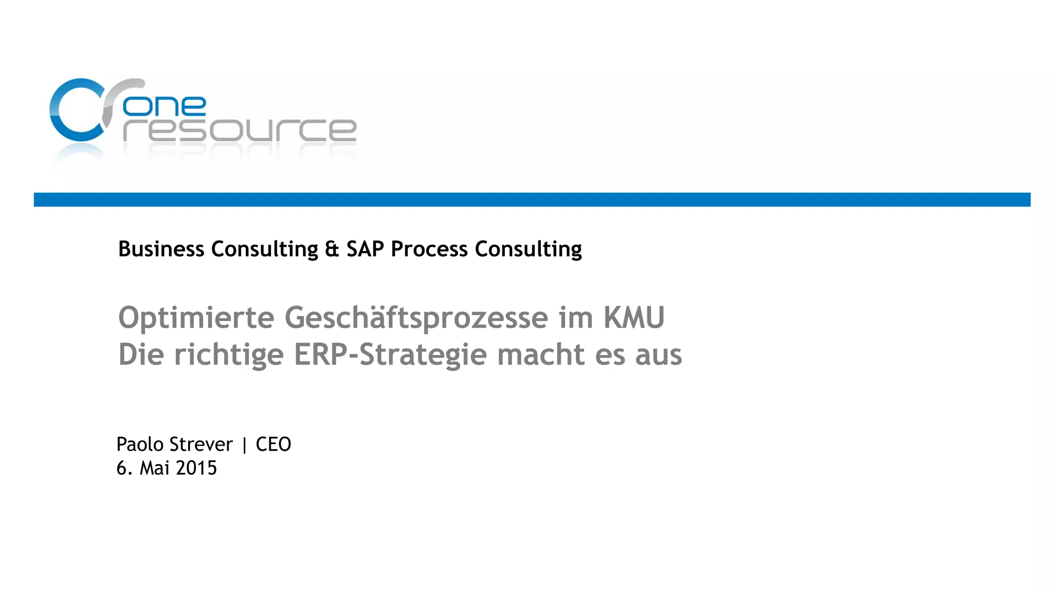 Das Dokument behandelt die Optimierung von Geschäftsprozessen für kleine und mittlere Unternehmen (KMU) durch geeignete ERP-Strategien, und stellt die Rolle von Oneresource als SAP-Partner vor. Es wird die Notwendigkeit einer modernen ERP-Auswahl aufgrund technischer Entwicklungen und veralteter Systeme thematisiert, während zwei aktuelle Selektionsansätze, Design Thinking und COTS, vorgestellt werden. Empfehlungen umfassen die Nutzung des COTS-Ansatzes für nicht-kernkompetente Aufgaben und Design Thinking für Bereiche, die Wettbewerbsvorteile schaffen.
