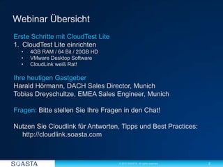 Das Dokument beschreibt die Einrichtung und Nutzung von CloudTest Lite, einem kostenlosen Tool für Lasttests von Web- und mobilen Anwendungen, das keine zeitlichen Begrenzungen hat und die Erstellung sowie Durchführung von Tests mit bis zu 100 virtuellen Benutzern ermöglicht. Es bietet Echtzeitanalysen und Unterstützung für verschiedene Web- und mobile Technologien. Außerdem werden Themen wie Testmanagement, Debugging und die Verwendung eigener Funktionen angesprochen.