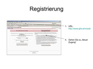 Die Registrierung für die Moodle-Plattform erfolgt über die URL http://www.glia.at/moodle/login/index.php, wo Benutzer ein neues Konto erstellen und ihre Registrierung per E-Mail bestätigen müssen. Nach dem Login können sie auf Kursangebote zugreifen, ihr Profil bearbeiten und am Chat sowie im Hilfeforum teilnehmen. Die Nutzung der Foren ermöglicht das Erstellen und Diskutieren von Themen sowie das Abonnieren von Beiträgen per E-Mail.