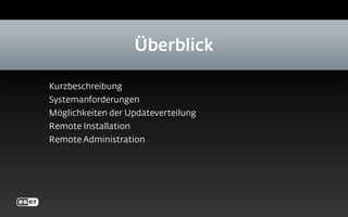 Das Dokument beschreibt die Funktionen und Systemanforderungen des ESET Remote Administrators, einem Tool zur Verwaltung von Sicherheitslösungen für verschiedene Plattformen wie Windows, Mac OS X und Linux. Es behandelt die Möglichkeiten zur Remote-Installation, Update-Verteilung und die Verwaltung von Gruppen und Policies, sowie Features wie Benachrichtigungen, Reporting und Quarantäneverwaltung. Außerdem werden die technischen Voraussetzungen und Kommunikationsports aufgeführt, die für die Verwendung des Systems erforderlich sind.