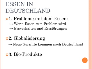 Das Dokument behandelt die Probleme von Essstörungen in Deutschland, einschließlich Magersucht und Bulimie, die vor allem Frauen betreffen und ernsthafte gesundheitliche Folgen haben können. Es wird auch auf die Globalisierung der Esskultur eingegangen, die zu einer Verdrängung regionaler Produkte führt und international populäre Gerichte wie McDonald's oder Döner Kebab hervorhebt. Zudem wird das Wachstum des Bio-Marktes in Deutschland erwähnt, bei dem die Nachfrage nach ökologisch produzierten Lebensmitteln stark angestiegen ist.