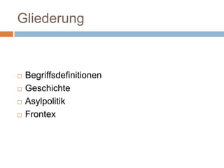 Das Dokument beschreibt die europäische Migrationspolitik, die durch verschiedene Abkommen und Programme, wie die Genfer Flüchtlingskonvention und das Lissabon-Abkommen, geprägt ist und sowohl Asylpolitik als auch Grenzsicherung umfasst. Es wird die Definition von Migration, Flüchtlingen und Asyl erörtert sowie die Herausforderungen zwischen Menschenrechten und staatlicher Kontrolle aufgezeigt. Die Rolle der Agentur Frontex wird kritisch betrachtet, insbesondere hinsichtlich ihrer Befugnisse und der Gefahren für Menschenrechte.