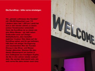 Die EuroShop 2014, eine bedeutende Handelsmesse mit über 109.000 Besuchern, zeigt aktuelle Trends im Bereich Messe- und Shopdesign. Es gibt einen Wechsel hin zu geschlossenen Raumkonzepten, variabler Lichtdramaturgie und einem Mix aus klaren Designs mit verspielten Accessoires, während der unvollendete Look mit recycelten Materialien und starken Farben im Vordergrund steht. Traditionelle weiße Designs werden durch dunklere Hintergründe und lebendige Farben ersetzt, was auf eine neue Ästhetik im Messebau hinweist.