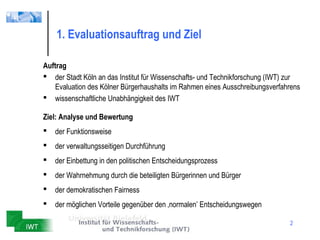 Das Dokument präsentiert die Evaluation des Bürgerhaushalts der Stadt Köln, durchgeführt vom Institut für Wissenschafts- und Technikforschung (IWT). Es analysiert die Funktionsweise, Wahrnehmung und demokratische Fairness des Verfahrens und umfasst methodische Ansätze sowie Kriterien zur Bewertung der Bürgerbeteiligung. Zusammengefasst werden positive Rückmeldungen zu den Plattformfunktionen, jedoch auch Herausforderungen wie eine überrepräsentierte, gebildete Teilnehmerschaft und Verbesserungsvorschläge zur Optimierung des Verfahrens.