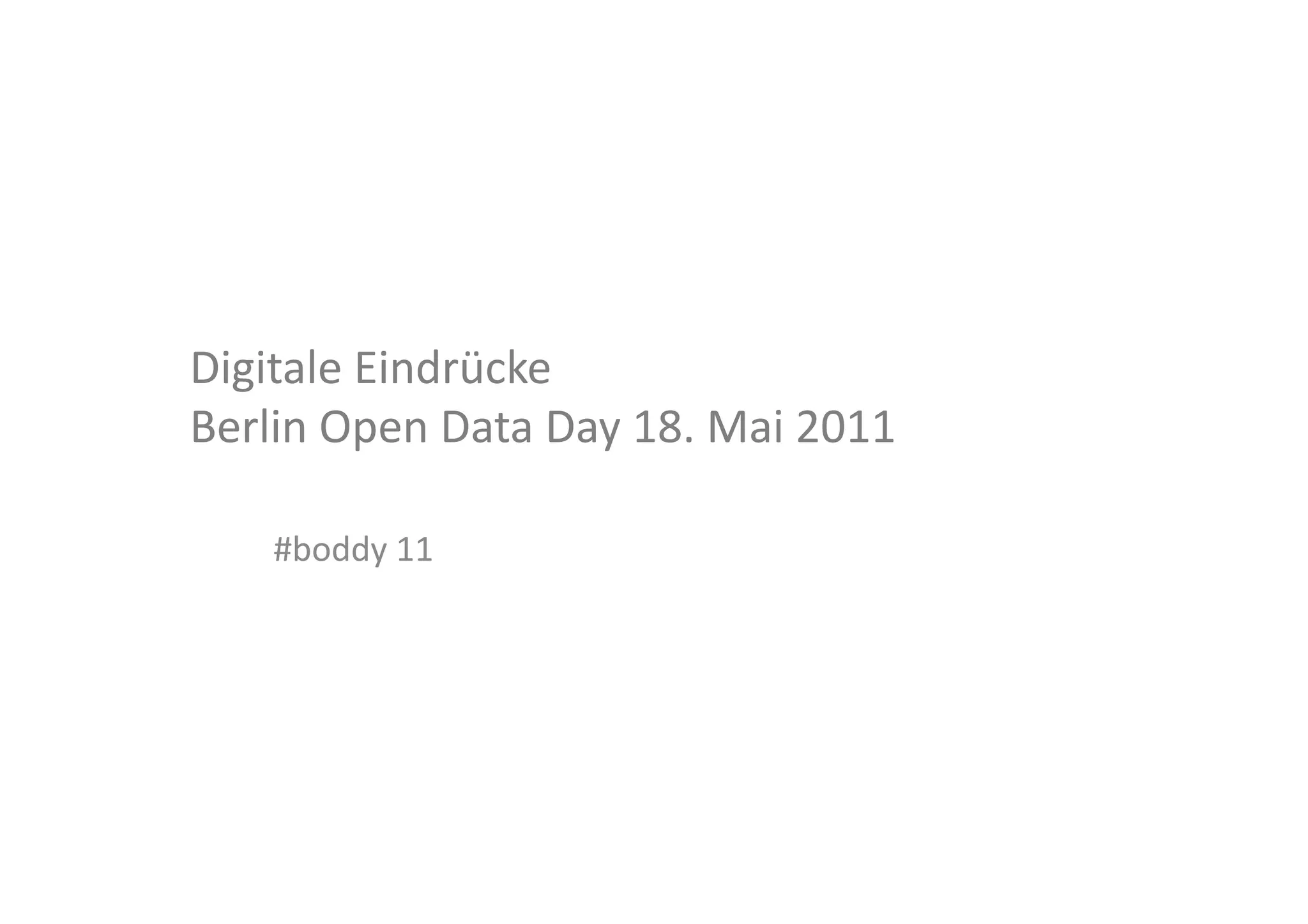 Das Dokument beschreibt den Berlin Open Data Day am 18. Mai 2011, bei dem verschiedene Projekte und Initiativen zur Veröffentlichung und Nutzung öffentlicher Daten vorgestellt wurden. Schlüsselfiguren und Meinungen betonen die Wichtigkeit der Datenfreigabe für die Bürger und die Rolle des Staates dabei. Es werden zahlreiche Projekte erwähnt, darunter der Kiezatlas, offene Haushaltsdaten und die Wheelmap, die alle dazu beitragen sollen, das Verständnis und die Zugänglichkeit von Daten zu fördern.