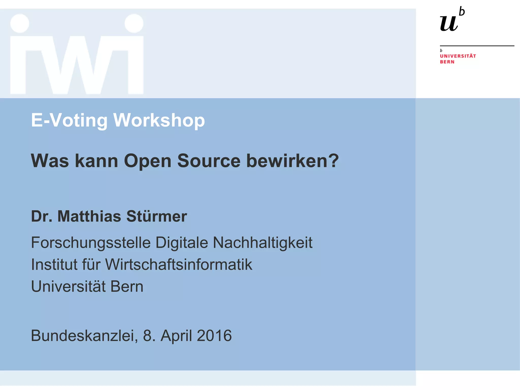 Der Workshop von Dr. Matthias Stürmer an der Universität Bern behandelt die Auswirkungen von Open Source Software, insbesondere im Bereich der E-Voting-Systeme. Es werden die Definitionen, Vorteile, Herausforderungen und die politische Landschaft rund um Open Source diskutiert, sowie die Geschichte und Strategien in der Schweiz und international. Ziel ist es, Transparenz, Lieferantenunabhängigkeit und Kosteneinsparungen durch die Nutzung von Open Source Software zu fördern.